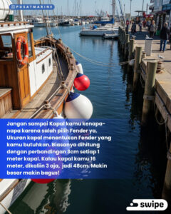 Jangan sampai Kapal kamu kenapa- napa karena salah pilih Fender ya. Ukuran kapal menentukan Fender yang kamu butuhkan. Biasanya dihitung dengan perbandingan 3cm setiap 1 meter kapal. Kalau kapal kamu 16 meter, dikaliin 3 aja, jadi 48cm. Makin besar makin bagus!