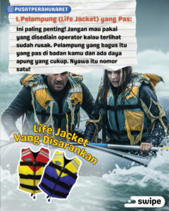 Ini paling penting! Jangan mau pakai yang disediain operator kalau terlihat sudah rusak. Pelampung yang bagus itu yang pas di badan kamu dan ada daya apung yang cukup. Nyawa itu nomor satu!