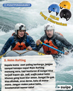 Kepala kamu aset paling berharga, jangan sampai kenapa-napa! Main Rafting memang seru, tapi benturan di sungai bisa terjadi kapan aja. Jadi, wajib pakai helm khusus yang kuat biar aman. Sungai itu gak bisa ditebak, arus deras, batu di mana-mana. Jangan males pakai helm, keselamatan nomor satu!