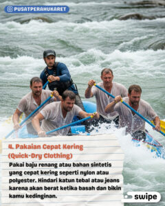 Pakai baju renang atau bahan sintetis yang cepat kering seperti nylon atau polyester. Hindari katun tebal atau jeans karena akan berat ketika basah dan bikin kamu kedinginan.