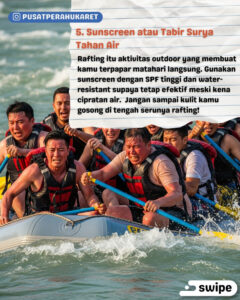 Rafting itu aktivitas outdoor yang membuat kamu terpapar matahari langsung. Gunakan sunscreen dengan SPF tinggi dan water- resistant supaya tetap efektif meski kena cipratan air. Jangan sampai kulit kamu gosong di tengah serunya rafting!