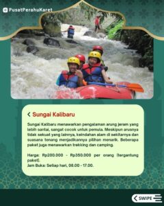 Sungai Kalibaru menawarkan pengalaman arung jeram yang lebih santai, sangat cocok untuk pemula. Meskipun arusnya tidak sekuat yang lainnya, keindahan alam di sekitarnya dan suasana tenang menjadikannya pilihan menarik. Beberapa paket juga menawarkan trekking dan camping.