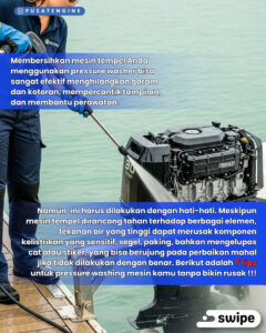 2. Saat melakukan pressure washing pada mesin, penting untuk jaga jarak minimal 2 meter antara ujung nozzle dan permukaan mesin. Ini dilakukan agar tekanan air yang kuat tidak merusak komponen sensitif seperti kabel,  konektor, atau bagian kecil lainnya. Selain itu, menjaga jarak juga bisa membantu distribusi air lebih merata,  sehingga pembersihan lebih efektif tanpa risiko lecet atau kerusakan.