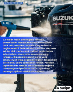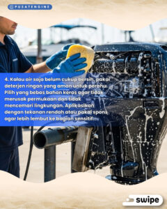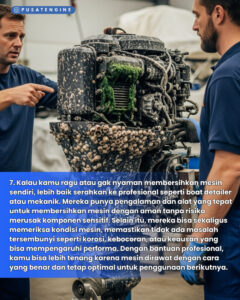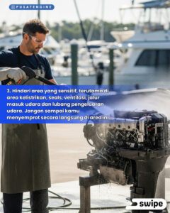 7. Kalau kamu ragu atau gak nyaman membersihkan mesin sendiri, lebih baik serahkan ke profesional seperti boat  detailer atau mekanik. Mereka punya pengalaman dan alat yang tepat untuk membersihkan mesin dengan aman tanpa risiko merusak komponen sensitif. Selain itu, mereka bisa sekaligus memeriksa kondisi mesin, memastikan tidak ada masalah tersembunyi seperti korosi, kebocoran, atau keausan yang bisa mempengaruhi performa. Dengan bantuan profesional, kamu bisa lebih tenang karena mesin dirawat dengan cara yang benar dan tetap optimal untuk penggunaan berikutnya.