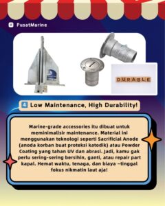 Marine-grade accessories itu dibuat untuk meminimalisir maintenance. Material ini menggunakan teknologi seperti Sacrificial Anode (anoda korban buat proteksi katodik) atau Powder Coating yang tahan UV dan abrasi. Jadi, kamu gak perlu sering-sering bersihin, ganti, atau repair part kapal. Hemat waktu, tenaga, dan biaya —tinggal fokus nikmatin laut aja!