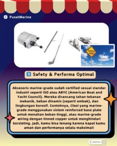 Aksesoris marine-grade sudah certified sesuai standar industri seperti ISO atau ABYC (American Boat and Yacht Council). Mereka dirancang tahan tekanan mekanik, beban dinamis (seperti ombak), dan lingkungan korosif. Contohnya, Cleat yang marine-grade menggunakan sistem reinforced base plate untuk menahan beban tinggi, atau marine-grade wiring dengan tinned copper untuk menghindari korsleting. Jadi, kamu bisa tenang karena kapal kamu aman dan performanya selalu maksimal!