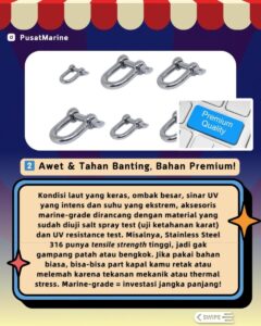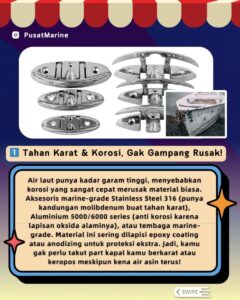 Kondisi laut yang keras, ombak besar, sinar UV yang intens dan suhu yang ekstrem, aksesoris marine-grade dirancang dengan material yang sudah diuji salt spray test (uji ketahanan karat) dan UV resistance test. Misalnya, Stainless Steel 316 punya tensile strength tinggi, jadi gak gampang patah atau bengkok. Jika pakai bahan biasa, bisa-bisa part kapal kamu retak atau melemah karena tekanan mekanik atau thermal stress. Marine-grade = investasi jangka panjang!