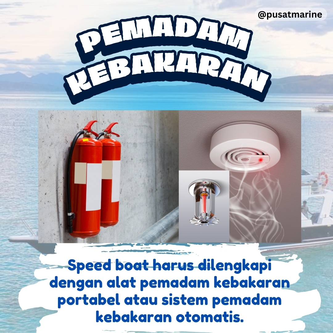 3. Pemadam Kebakaran: Speed boat harus dilengkapi dengan alat pemadam kebakaran portabel atau sistem pemadam kebakaran otomatis